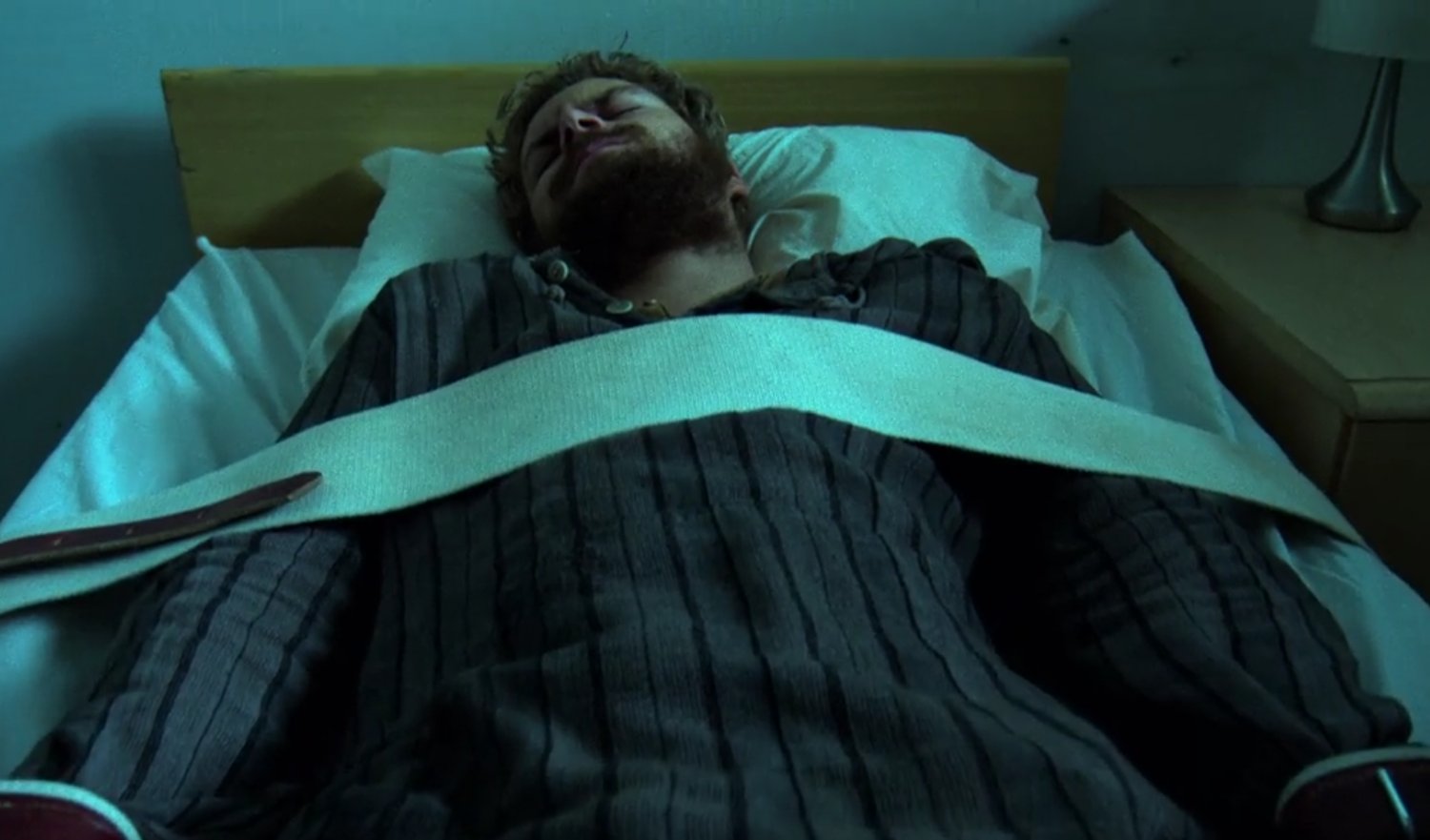 passing out. Joy drugged the tea, obviously. He walks up in a mental hospital chained