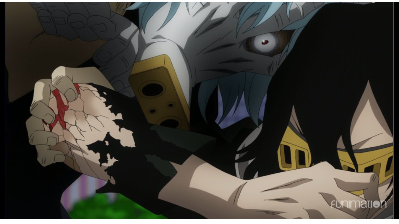 him in a grapple, and pretty much disintegrates Aizawa’s elbow right down to
