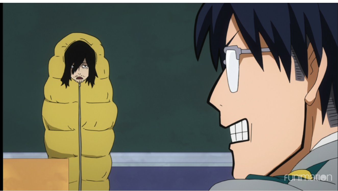 | Mr. Aizawa naps while the students vote. Why is he allowed to bring a sleeping bag into class? |