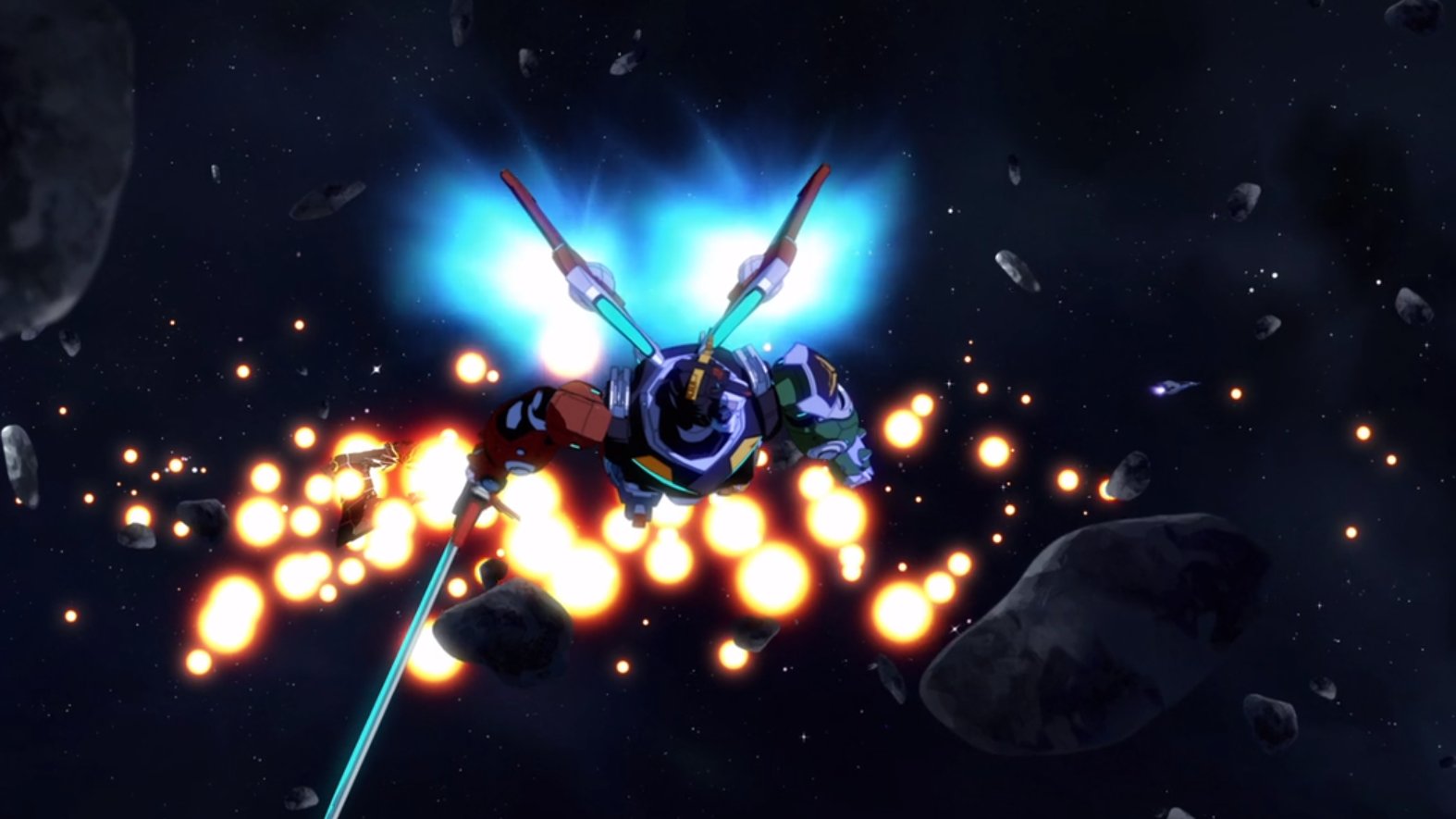 Voltron, dodging the other Gulra fighters, but shockingly, a single fighter can’t
