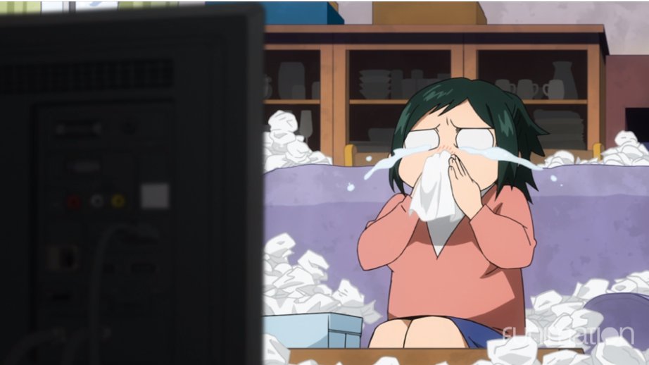 Midoriya surrounded by a small mountain of tissues as she watches the match