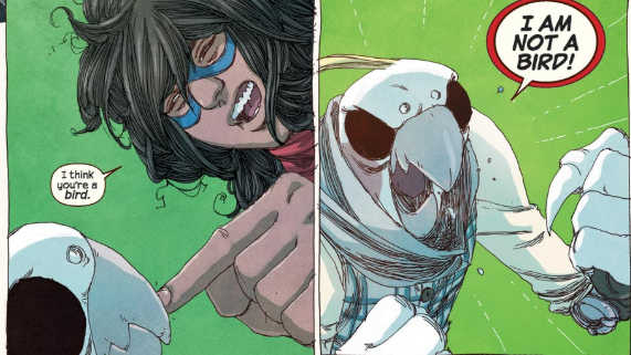 Kamala is a very fun character. I read the first dozen or so comics of her initial run, and fell in love with her on the firsts page. It involved her basically glaring at a sandwich for daring to have bacon on it, since that food is not halal (Muslim equivalent to kosher). She’s got a great energy to her. She’s incredibly determined and peppy when she needs to be, but has also learned to watch where she steps as she’s grown as a hero. Her powers are also very impressive, being reminiscent of other heroes, like Mr. Fantastic, Ant Man and so on, but mixed together in a way that is wholly her own. And the fact that her original nemesis was Thomas Edison that was also a Cockatiel was just stupid funny. It’s also interesting to see how a child of immigrants handles that side of her life, as she tries to balance being a good hero with being a good daughter and a good Muslim. Its clear that while there are aspects of her faith that bother her, the dietary and gender restrictions being the most obvious, that she’s still proud of her faith and wants to keep being a good Muslim. Hey, the majority of heroes that are religious have either expressly stated or implied to being some variety of Christian, Jewish, or a being of a mythological pantheon. It’s nice to see more representation is all I’m saying. I think that in the short time she’s been a hero, she’s met that lofty goal of being worthy of her namesake and surpassed it by leaps and bounds. So yeah, in short, she’s fun, unique, and I’m glad she’s caught on as quickly as she has.