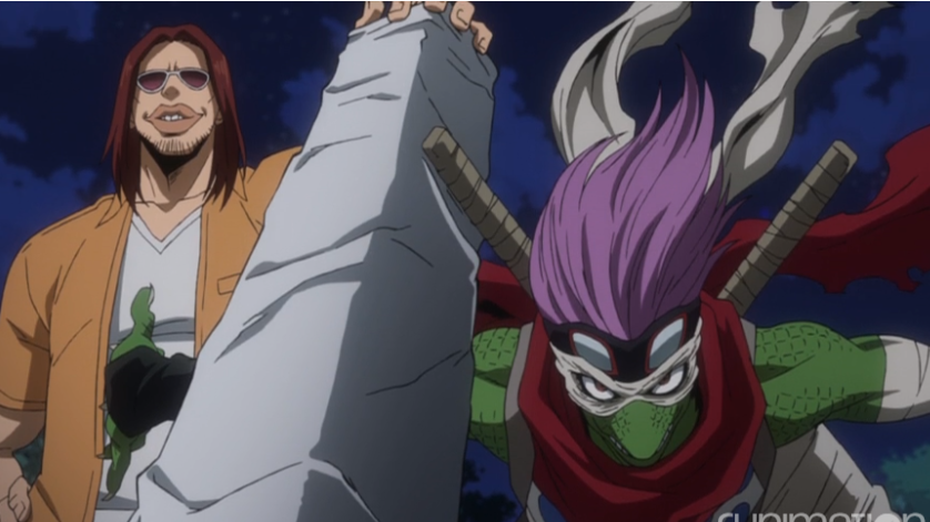 We open with class 1B getting up with their homeroom teacher, Vlad King, explaining the basic premise of the training camp, to push the kids quirks to the next level. We’re then shown some of what the 1A students are doing to power up. Bakugo is dunking his hands in near boiling water to build up his sweat glands and make larger explosions (not sure if that sciences). Todoroki is sitting in a tub and rapidly freezing and incinerating the area around him to build up his heat tolerance. Guys like Aoyama and Sero are using their powers constantly to try and build their endurance. And Tokoyami is training in a cave to get better control of his dark shadow at night. Those are just some of the highlights. We’re then introduced to the full Wild, Wild Pussycats team. There’s Mandalay and Pixie-Bob, whom we’ve already met, as well as Ragdoll and Tiger. Two things, 1. Aside from Tiger, all of the other Pussycat’s names are based on Cat breeds, so that’s why they seem kind of random; and 2. While it’s not stated in the episode, Horikoshi has revealed that the intense Tiger is in fact a trans-man, having gone through gender reassignment at some point in the past so his body would better match how he feels. I give props to Horikoshi for including some Trans representation. Though if I have trans readers, I would like to know if Tiger falls under Good representation, or Bad representation.